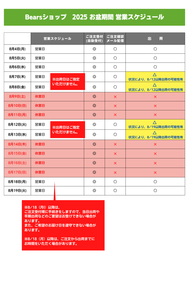 お盆期間中は、当ショップの営業スケジュールを下記の通り変更させていただきます。