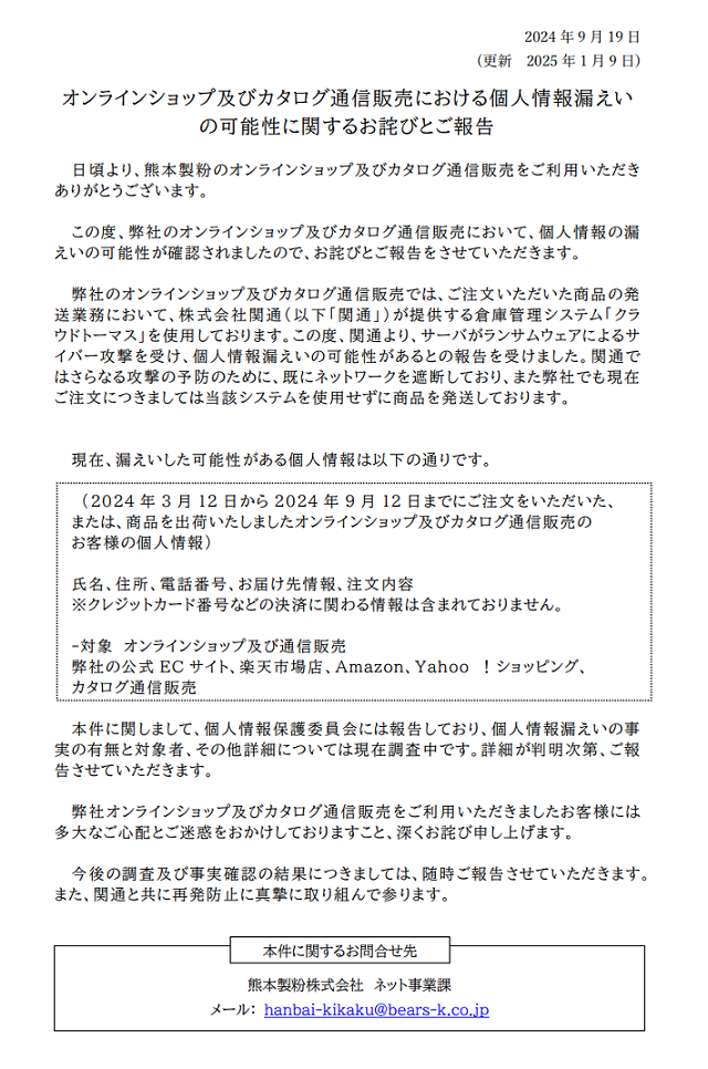 【重要】オンラインショップ及びカタログ通信販売における個人情報漏えいの可能性に関するお詫びとご報告